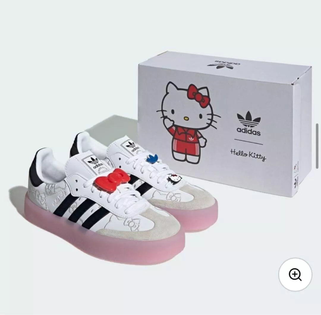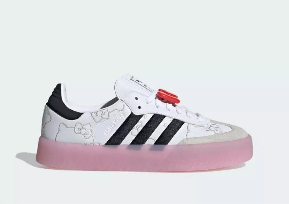 Las adidas Sambae Hello Kitty son una encantadora colaboración entre adidas y Sanrio que fusiona la clásica silueta de las Samba con el adorable mundo de Hello Kitty. Este modelo presenta una parte superior de cuero blanco adornada con estampados negros que delinean el rostro de Hello Kitty, complementada con las icónicas tres franjas laterales y un refuerzo de gamuza negra en la puntera. El talón y la suela de goma semitranslúcida en rosa pálido añaden un toque distintivo al diseño. Detalles adicionales incluyen el logo de Hello Kitty en la lengüeta y el talón, así como una plantilla decorada con gráficos exclusivos del personaje. Esta colaboración ofrece un giro moderno y divertido a un clásico de adidas, combinando comodidad y estilo para los entusiastas de la moda urbana y los seguidores de Hello Kitty.