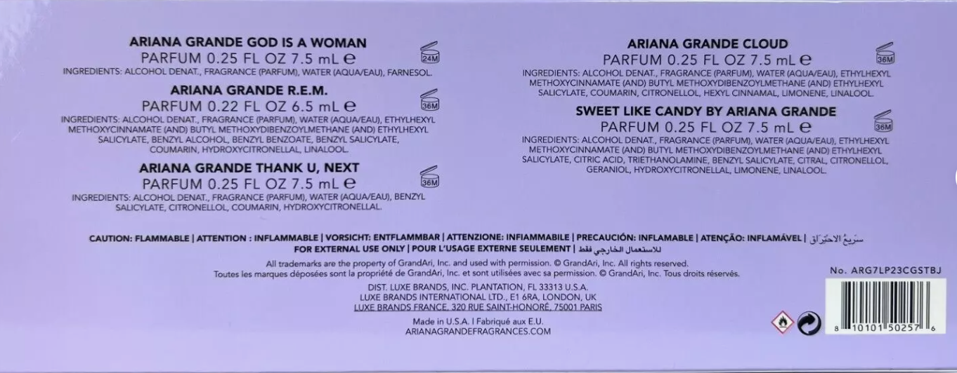 Este set de perfumes minis es una colección completa de las fragancias de Ariana Grande. Incluye cinco perfumes en miniatura de 7.5 ml cada uno. Los aromas que encontrarás en este set son:
